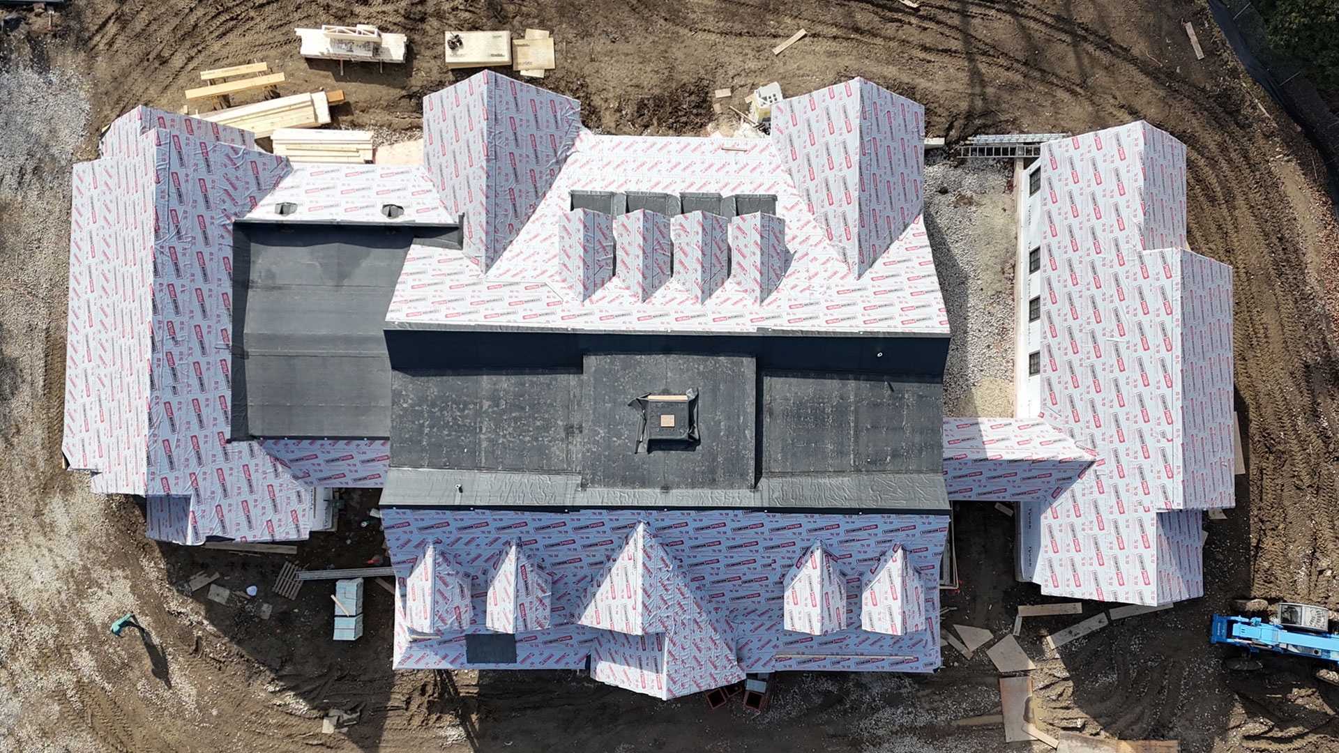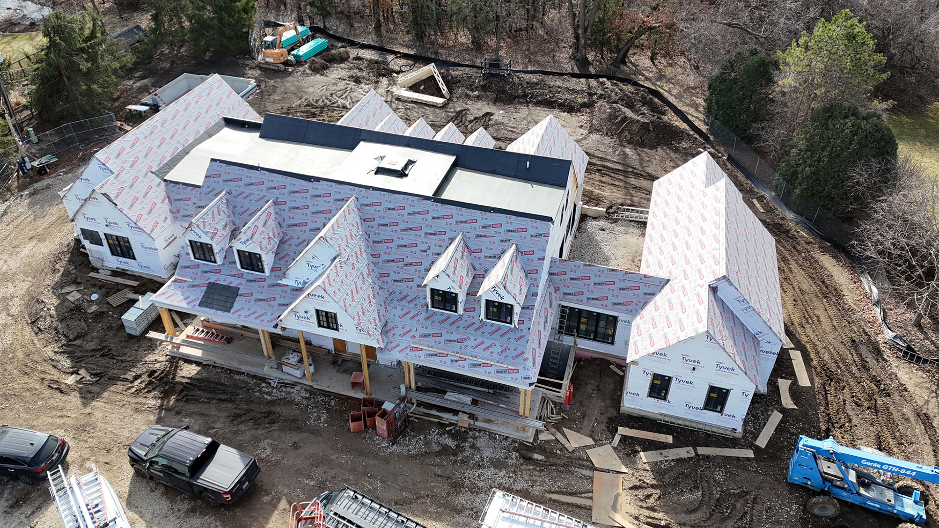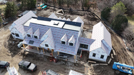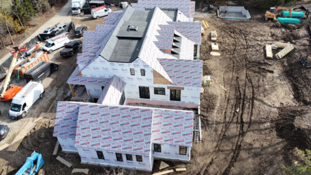 Brava Shake Roofing installation has begun. A temporary waterproofing membrane has been applied to the entire roof. The detailed work on the exterior will consist of Wisconsin stone, cementitious, stucco, and a Brava simulated shake roof.